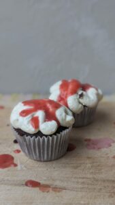 Während die Soße abkühlt, hole die gebackenen Muffins aus dem Ofen heraus. Spritze sie danach wie auf dem Foto angegeben links und rechts in Wellen zweimal hintereinander mit der Creme auf, das Gleiche wiederholst du in der Mitte, nur mit geraden Linien. Wenn deine Blutsoße abgekühlt ist, träufle sie darüber. Und jetzt sind deine Halloweenmuffins fertig.